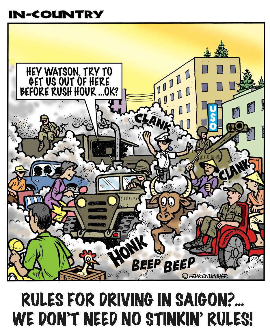 Phil enlisted in the Army in 1965 where he served for years in Vietnam. He became a graphic designer and has worked for the state of Oregon for 26 years. He retired in 2003 and started the Cartoon "In-Country". The cartoons reflect his experiences during his tour of duty in South Vietnam.