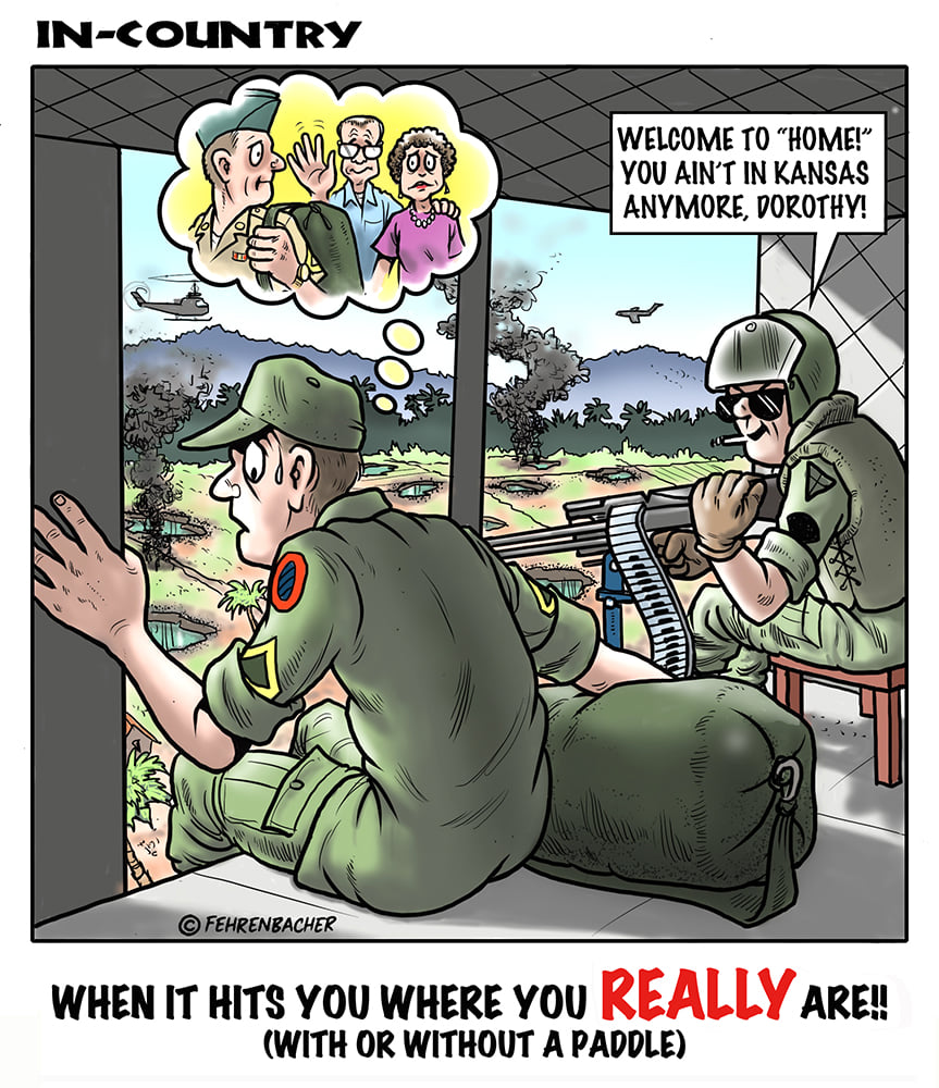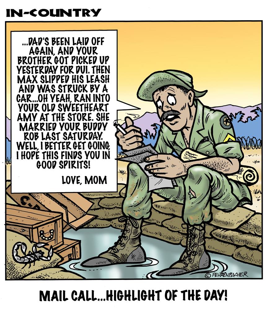Phil enlisted in the Army in 1965 where he served for years in Vietnam. He became a graphic designer and has worked for the state of Oregon for 26 years. He retired in 2003 and started the Cartoon "In-Country". The cartoons reflect his experiences during his tour of duty in South Vietnam.